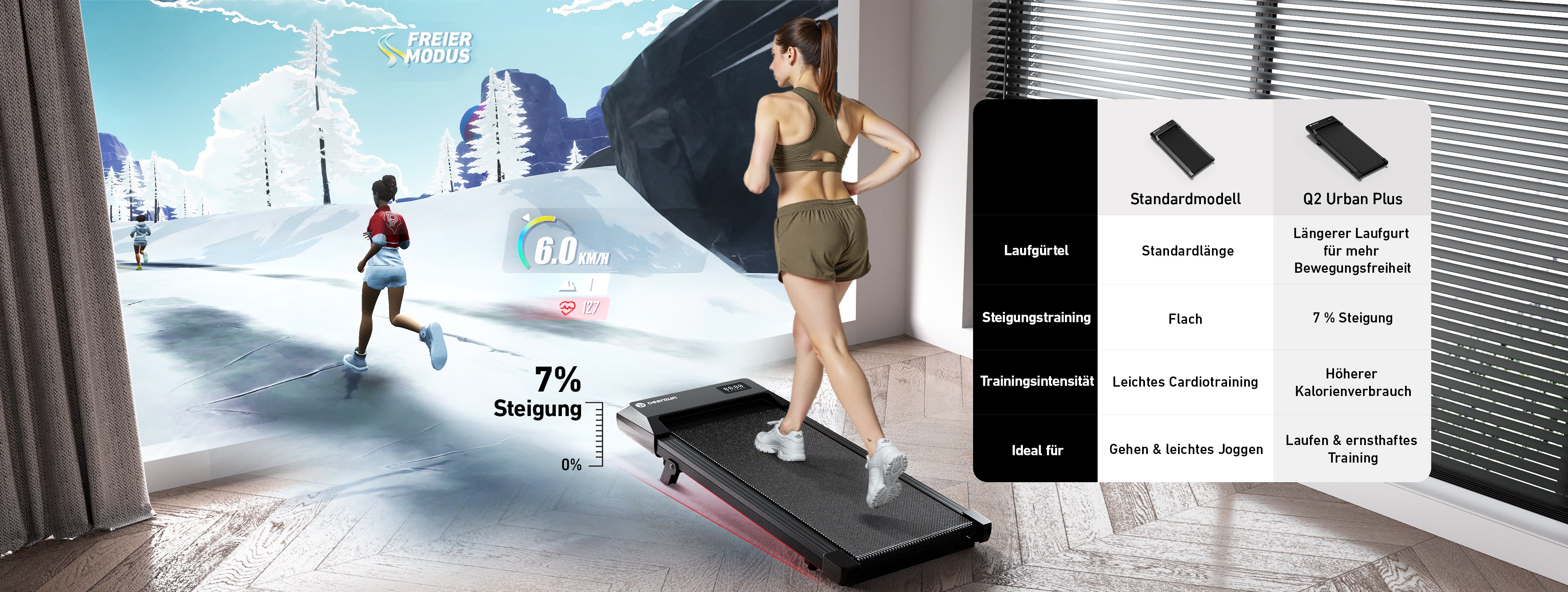 DeerRun Q2 Urban Plus Walking Pad mit 7% Steigung & platzsparendes, 1-6 km/h